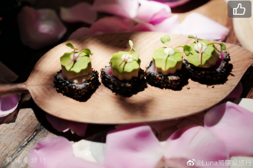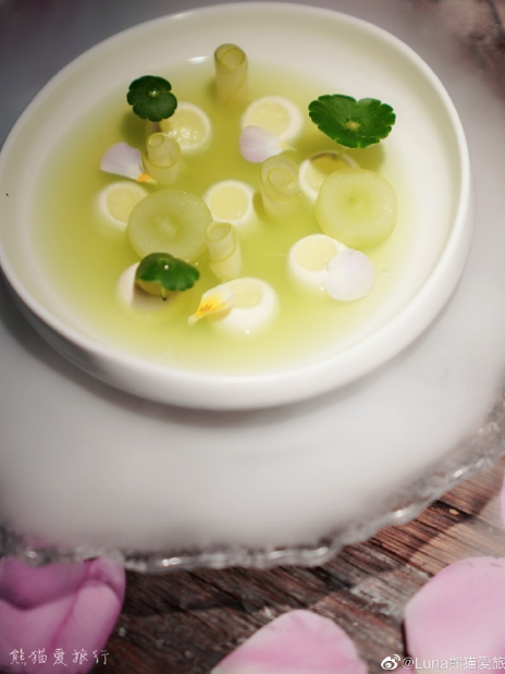 真是太喜欢国贸商城的这家花厨,暗黑又梦幻的环境,星光点点,繁华美境,桌上散落的花瓣,仙气飘飘的菜品,每一道菜品呈盘都仿佛欣赏艺术品一般。还尝到了无敌好喝的花厨蜜桃米露,好喜欢恬淡的口感!