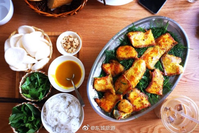 吕公望烤鱼将烤鱼与茴香在烤盘中加热,配以虾片、香菜、干捞粉等,鲜香味美,so yummy~
