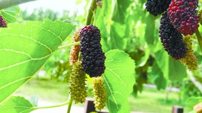 现在,正是桑椹的盛果期,桑椹挂满枝头,紫黑的、白的、红的,色彩缤纷。紫黑的桑椹,黑中发亮,被称为“黑珍珠”;白色的桑椹米脂般白嫩,外面像是抹了一层蜡,名为“白蜡皮”;红色的桑椹熟透后,白里透着点红,美其名曰“红蜻蜓”。
