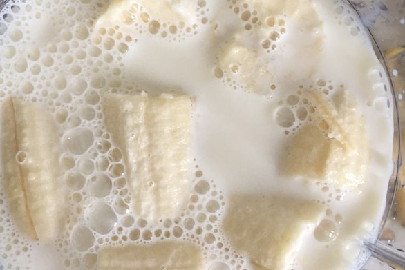 香蕉剥皮切块,加入牛奶放进榨汁机,就完成了。