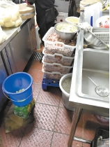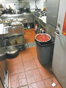 每家厨房门口都有一个透明玻璃做的围挡,里面堆放着不少纸箱子、面粉和厨房用品。在一家厨房里靠近门口的地面上,记者看到一个装满馒头的大塑料袋。在另一家厨房,记者看到冰箱前放着一个不到一米高的垃圾桶,桶上架着一个铁盆,里面装了半盆鲜红的辣椒,看上去已经清洗过了。盆下的垃圾桶口就套着一个泛着油光、边缘还沾着白色液体的黑色塑料袋。厨房的地面满是水渍,上面还散落着不少菜叶的碎末。