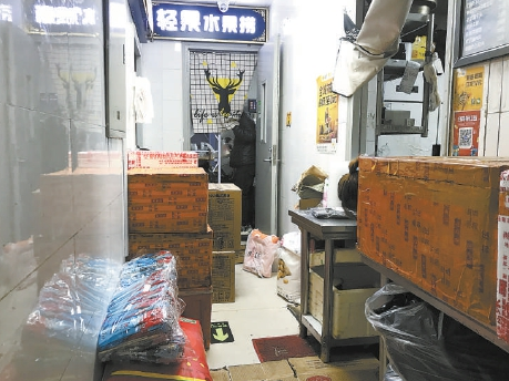 随后,记者走进右侧的岔道,里面有两间厨房,最里面的门头挂着一块写有“水果捞”的招牌,一米多宽的过道两侧摆着一张桌子和几个箱子,最里面的一个大箱子占了过道三分之二的空间,人员进出只能侧身,地面上铺着一块沾着油渍的纸板。