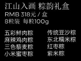 8粒装,2咸6甜不同口味的香粽;礼盒设计结合千里江山入画,风雅意趣,韵味悠存。