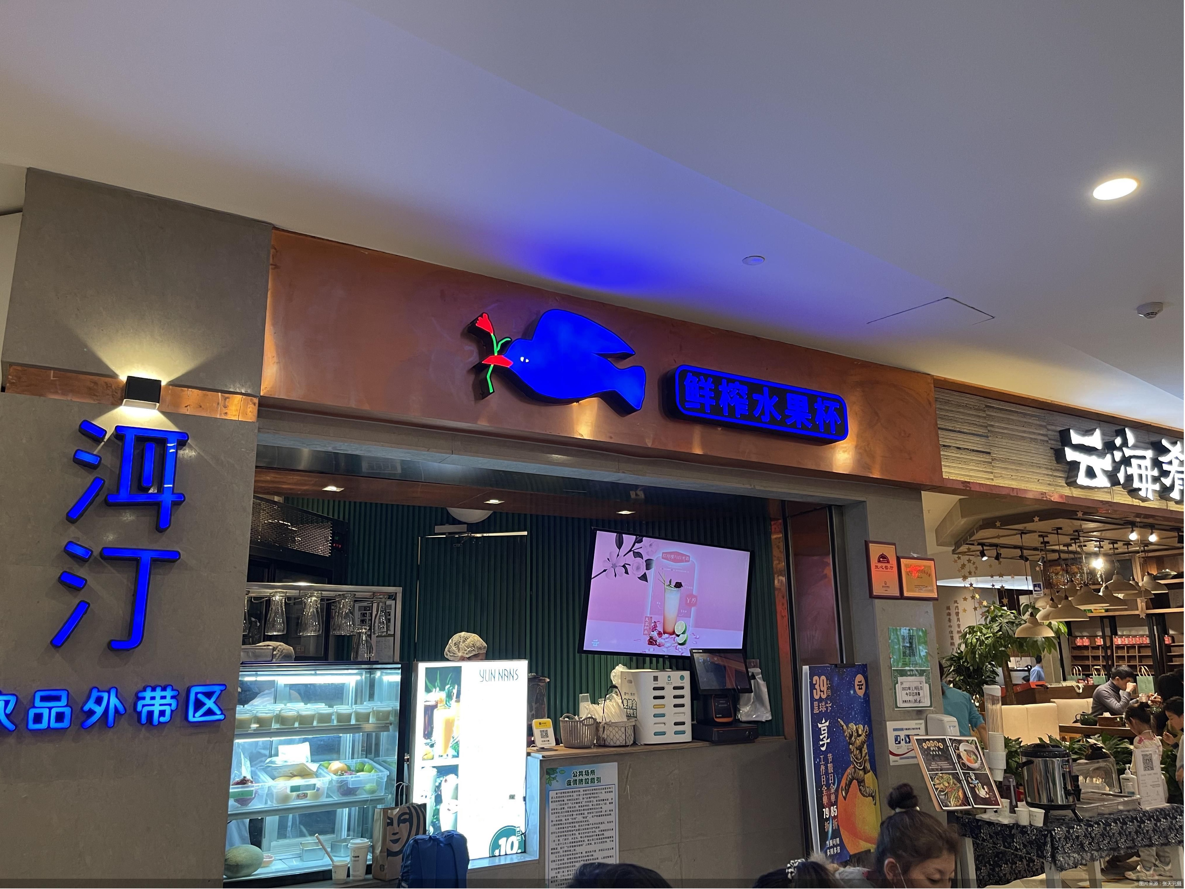 以云海肴云南菜为例,该品牌一门店旁的饮品外带区标有“洱汀饮品外带区”,门头有着“鲜榨水果”的字样。主要售卖鲜榨柑柑汁、百香果Mojito、红玫瑰与米酒、红豆奶茶等饮品,价格在16-28元不等。同时,该外带区还售卖黑糖豆花、鲜切水果盒、现烤玫瑰鲜花饼等产品,售价在12-19元之间。