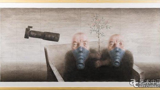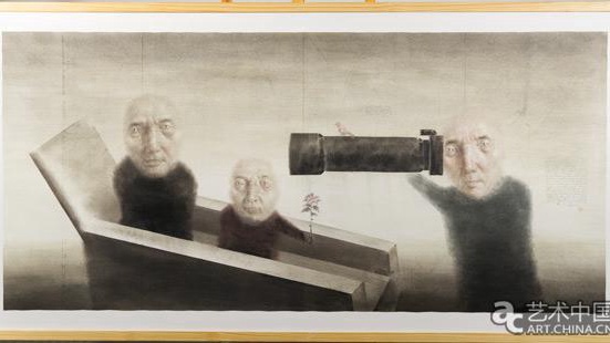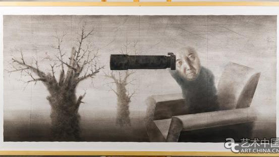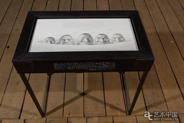 所谓“人类面孔”,并非专指曾晓峰作品中那些尺幅巨大的让人焦虑、不安,甚至是有些恐惧的人的肖象。这些形象尽管多以老人、小孩的面孔出现,偶尔也“变相”为游鱼、飞鸟、走狗、枯树,和画面中、铁柜上那些无法辨识的无意义的书写,但这些形象却是一个寓意深刻的容器,将一个时代的历史与艺术家个人的心灵史、精神史搅拌浇注其中。这个符号和图像,既是一个个具体的、有生命性格特征和社会属性的人的面孔,却也是抽象的、超越时空、国别和族群,包纳芸芸众生命运的“人类面孔”。