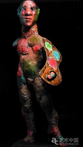 马库斯·吕佩尔茨,《绘画天才》,彩绘青铜雕塑,172x63x56cm,2016年