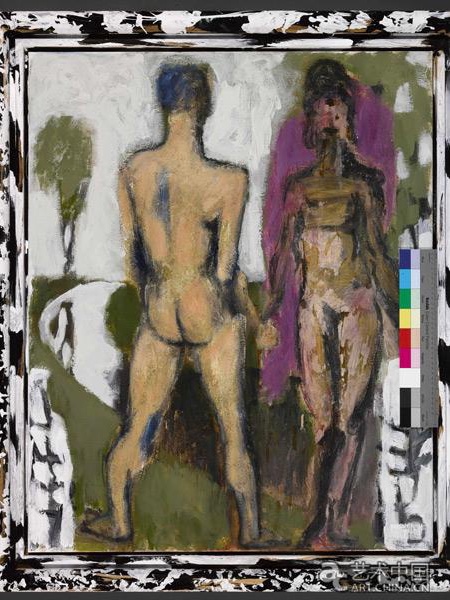 这件作品被艺术家命名为《裸背》。两个站立的裸体,似乎是一男一女,分别背对和面对观者,他们与画面左侧蜿蜒的河流而上耸立在河岸的树共同构成了画面的主体。裸背男子身体面对他右侧的女性,而左脚和头部都倾向左侧,人们在这幅画里所见到的是艺术家对自我复杂内心的诠释。人体、男人、女人、树木,河流,这些在吕佩尔茨的作品中反复出现并被着以低沉的色彩,德国人对存在主义的迷恋使得他的作品充满了仪式感和历史感,吕佩尔茨曾说:“我是一个传统的德国人,我是在延续德国从中世纪以来的悠久的绘画历史的基础上,用现代的绘画语汇来表现当下的德国精神。根据我的观察,我认为现代中国画家的处境和我是一样的,都在寻找传统的过程中表现当下。”