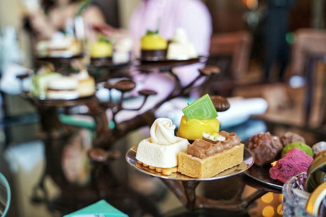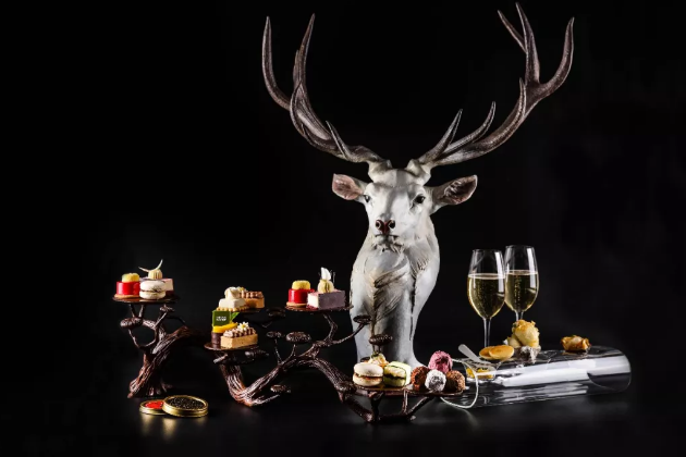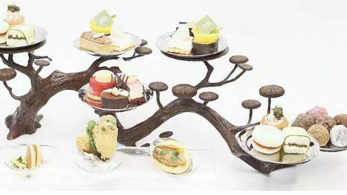 “松翠迎娇客,清风拂面来”,主厨携手“塑镜空间”定制了十款限量版迎客松青铜下午茶艺术托架,与酒廊重达2.3吨的青铜作品迎客松相互映衬。迎客松艺术托架树枝伸长舒展,点缀着薰衣草奶冻、樱花巧克力等多种花类甜品和鱼子酱帝王蟹、香脆龙虾卷等咸点,更有香槟茶饮相佐,迎接客人前来品尝。售价为人民币 768元/两位。位于国贸大厦80层的酒廊可饱览京城盛貌,适宜来一场高空身心放松之旅。身在优雅舒适的酒廊,目光可游离至西山,享用清爽下午茶,思绪飞扬云端。此款限量下午茶将长期供应。