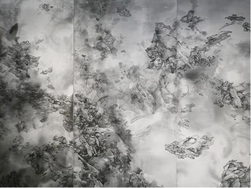 泰祥洲的作品《天象·方壶》采用了宋画的技法和绢本材料,描绘了被抽离时空的宇宙景象,山石的形象借鉴了陨石的一些形态。
