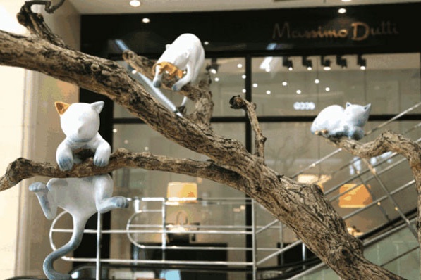 猫寄居于树上,悠然自得、憨态可掬。你看它的爪子搭在树上,像不像在荡秋千?
