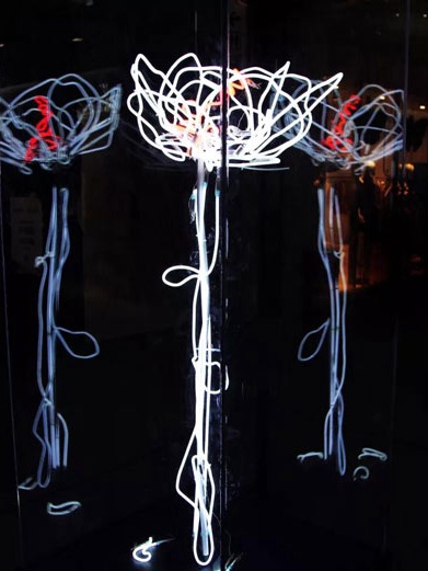 “一花一世界”,作品以单色霓虹灯做出花的造型,表达着现代都市生活的单一与孤寂。周围用透明介质包围,镜像作用使多个花显现其中,形成虚幻与真实的对比。