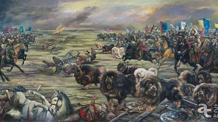 《一代天骄》以历史主题性绘画的方式,描绘了成吉思汗率军征服欧洲的场景。在这幅长度超过5米的油画中,成吉思汗率领骑兵将士自东向西进发,数十只凶猛异常的藏獒冲在最前面,成为部队的“先头兵”,对方的敌人大为惊骇、战马嘶鸣不前,已呈现出溃败之势。整幅画面硝烟弥漫、气氛凝重,藏獒位于画面中心位置,凶猛勇武的形象让人印象极为深刻。而这并非是作者的异想天开,据历史记载,成吉思汗征服欧洲的确有一只秘密部队,而这支令敌人闻风丧胆的部队成员就是——藏獒。