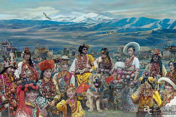 《雪域盛装》绘制完成于2016年,长3.6米,宽2.2米,描绘的则是身着西藏传统民族服饰的当代人的形象。画面中,远方群山连绵、草原广袤、雄鹰翱翔,位于藏族特色的民居散落其间,在画面的最前面则是身着盛装的藏族中青年和儿童的形象。他们的服装华丽、饰品精美,洋溢着节日的气氛。他们面向阳光,脸上露出的微笑透露了今天生活的幸福。