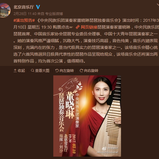 据北京音乐厅官方微博报道,“中央民族乐团演奏家董晓琳琵琶独奏音乐会”将于3月10日在北京音乐厅上演。
