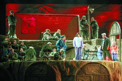 整个舞台最大的特色,是360°旋转舞台,全剧都在这个巨大的转台上展开。转台通体呈现土褐色,营造出黄土高原特有的沟壑纵横的质感,由上而下是巨大的碾子、山坡、乡间小路和窑洞,随着旋转角度的不同,呈现出不同的场景。担任该剧舞美设计的著名舞美设计师张武表示,这个舞台设计,象征平凡的人在历经生活碾压后的重生,迎来一个新的时代。旋转的舞台,意为时间在继续、生活在继续,没有停下来的时候。