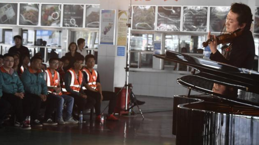 昨天下午,北京城市副中心的工地食堂里人头攒动,佩戴红蓝安全帽的建设工人们陆续入座。食堂里的清扫机刷刷作响,而在隔壁的休息室里,小提琴演奏家吕思清正在调整琴弦,他似乎对这里的陈设也充满好奇,因为,一场食堂里的音乐会即将上演。