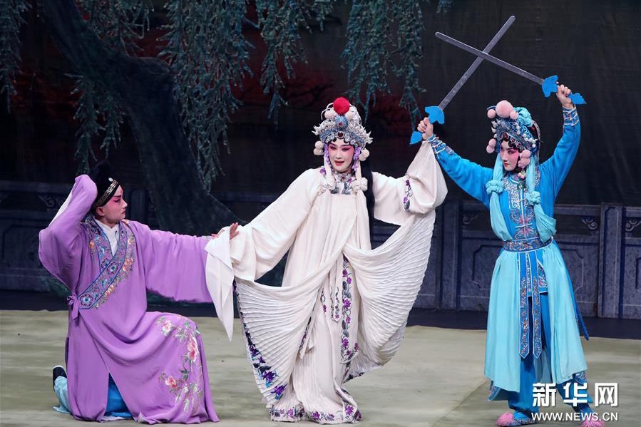 5月28日,青年演员马佳(中,剧中饰演白娘子)、李春(左,剧中饰演许仙)、蒋兰兰(右,剧中饰演小青)在香港大会堂表演梅派经典剧目《白蛇传—断桥》。 5月28日晚,由香港特区京昆剧团等主办的“京剧大师梅兰芳艺术专场崭新展演”在香港大会堂上演。来自北京、上海、哈尔滨、深圳等地的多位青年京剧演员演绎了梅派经典剧目《贵妃醉酒》《红线盗盒》《白蛇传—断桥》和《霸王别姬》,为香港市民献上一场视听国粹盛宴。