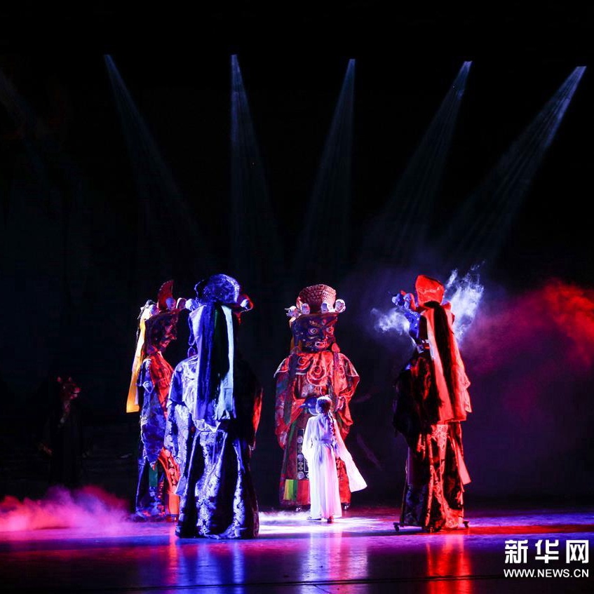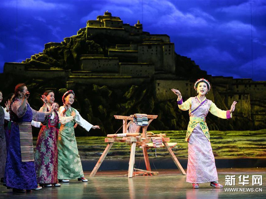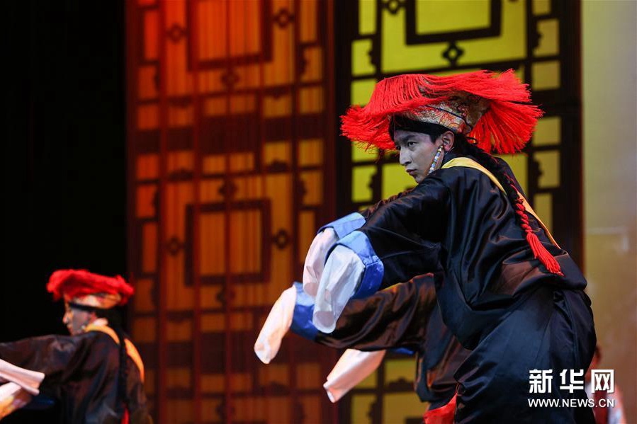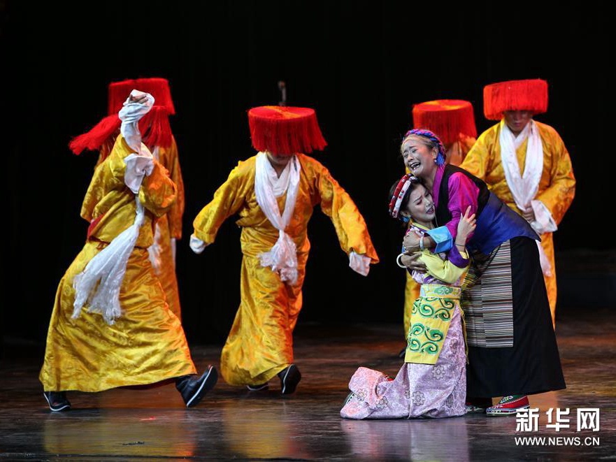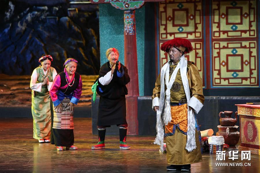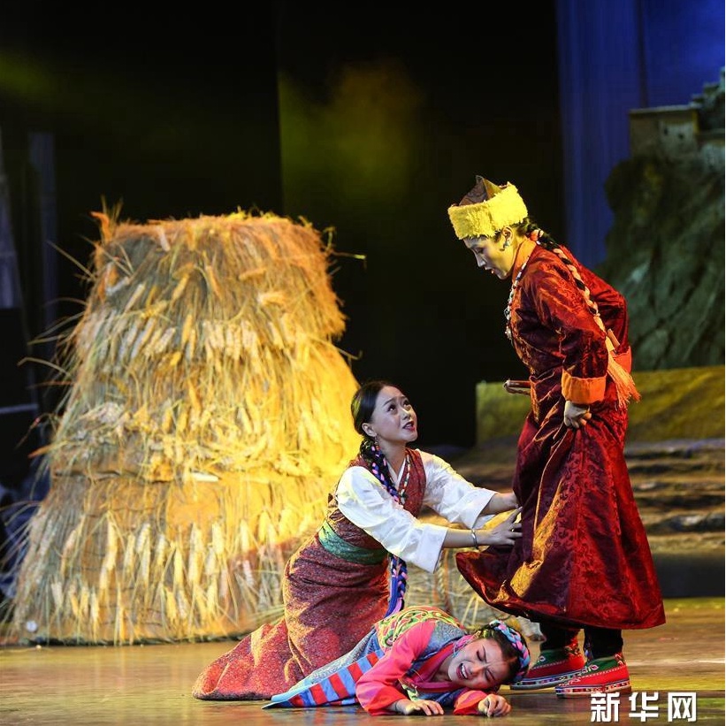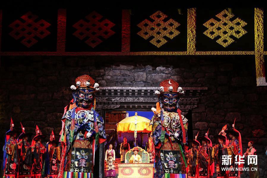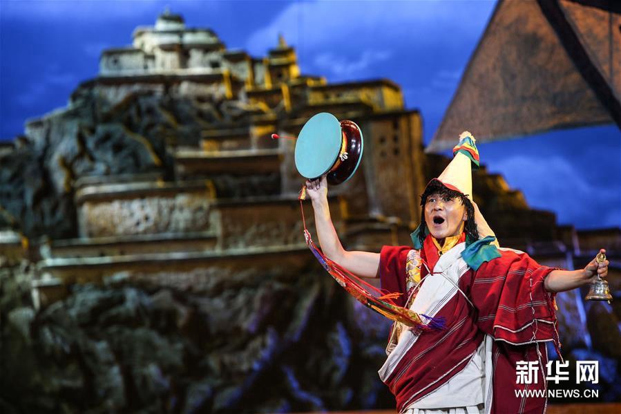6月27日,演员在改编传统藏戏《朗萨雯波》中演出。6月26日至27日,2018年全国基层院团戏曲会演参演剧目、由西藏自治区藏剧团编剧演出的改编传统藏戏《朗萨雯波》在北京中国评剧院上演。新华社记者 李京 摄
