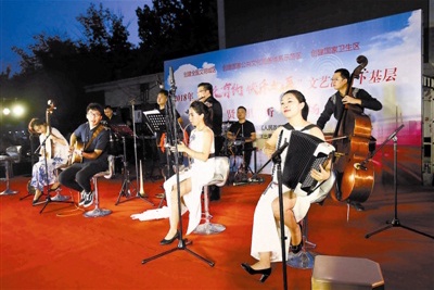 本报讯 (记者高丽)由北辰区政府主办,北辰区文广局、天津歌舞剧院协办的2018“文化有约 快乐北辰”文艺演出下基层活动,昨晚在北辰集贤里社区广场举行,天津歌舞剧院80·90梦乐团的青年演奏家组成的红色文艺轻骑兵小分队,为社区百姓送上了拿手曲目。