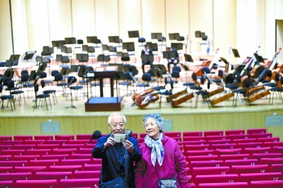 “怎么把交响乐带进寻常百姓的生活里”同样是“首都市民音乐厅”最关心的问题。自2016年启动以来,“首都市民音乐厅”一直坚持公益原则,让大家不花一分钱就能在家门口欣赏到高质量的演出。这一次,主办方通过社区提前把票送到了老人们手中。“能在重阳节有这样一场音乐会,感觉太好了。”75岁的彭阿姨一直喜欢听古典音乐,不仅是北交的忠实观众,还是著名指挥家谭利华的铁杆粉丝。“我家就住在北航对门,在这里听音乐会比去剧场方便多了。”陪着彭阿姨一起来看演出的是她81岁的老伴儿,两位老人早早地来到音乐厅等候演出开始。虽然一头青丝早已在年深日久的相伴中化为白雪,彭阿姨和老伴儿依然有说不完的话,观众席间,还有许多像他们一样的老两口儿忙着合影或自拍。“现在社会越来越关注老年人,我们觉得非常幸福,也很欣慰。”彭阿姨说。 J267 黄亮 摄