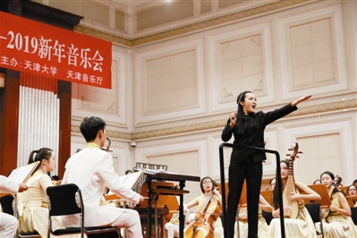 2日晚,由天津大学、天津音乐厅主办的“天籁之音”系列公益音乐会之“中西合璧——2019年新年音乐会”在天津音乐厅举行。北洋交响乐团、北洋民族管弦乐团为观众献上多首经典乐曲,让观众在优美乐曲中开启新的一年。张立 焦德芳摄