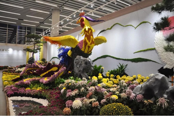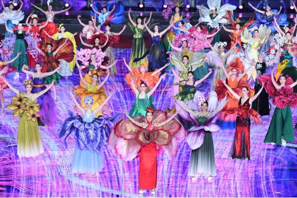 箜篌、花仙与插花表演《花团锦簇》,在柔美清澈的箜篌声中,众多花仙簇拥着插花艺术家,以太湖石为背景,凝聚出五彩缤纷的“长城之花”。