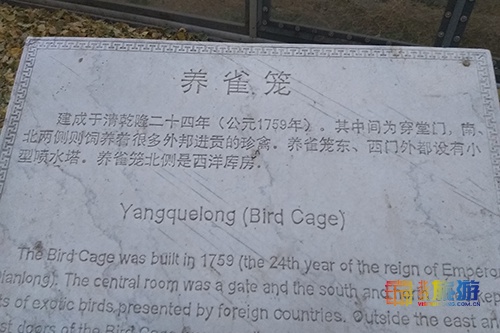 养雀笼位于圆明园黄花阵的东侧,实为一座西洋门,建成于1759年(乾隆二十四年)。明间为穿堂门,南北侧屋内笼养孔雀等鸟类,故名养雀笼。
