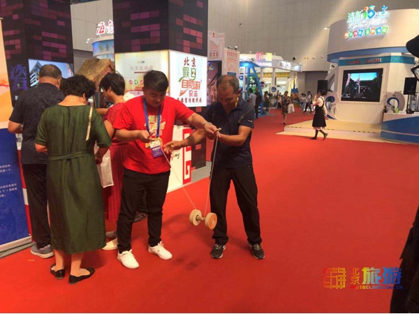 在展会现场,一位老大爷娴熟的表演抖空竹,一边表演一边告诉观众抖空竹技巧,引来众多人围观。