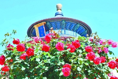 初夏的天坛公园,月季园里花团锦簇,祈年殿前蜂蝶曼舞,200余个品种的月季让600年古老祭坛在庄严肃穆中平添诗意和灵动。