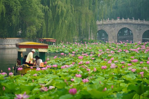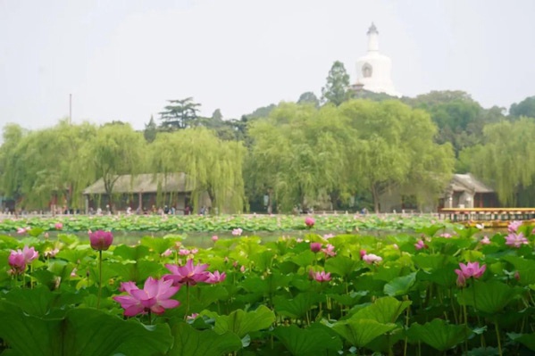 近日,北海公园荷花盛开,进入最佳观赏期。今年,北海公园南门内以太空莲、白洋淀红莲为主的8000平方米荷花湖荷花长势旺盛。