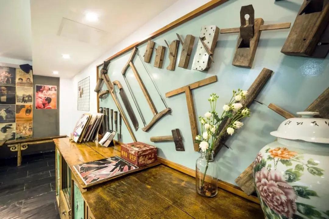 各种木工工具做成展示墙,老电影海报贴满墙面,满满怀旧复古风