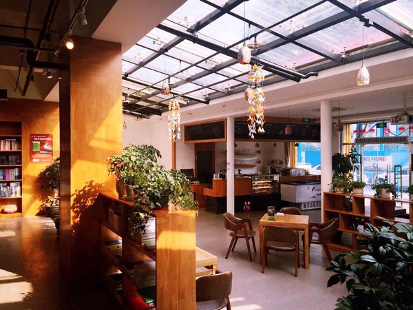 从北外西校区向东步行700米就可到达位于北外体育馆边的当绿咖啡馆。这个咖啡馆由北外毕业生创业开设,书店内的“员工”大多也是勤工俭学的在校大学生兼职的。