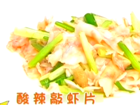 酸辣敲虾片,用小木槌敲制成虾片,再用氽的烹调技法使虾肉色白透明,虾尾鲜红呈扇形,故又称“凤尾敲虾”、“玻璃虾扇”。