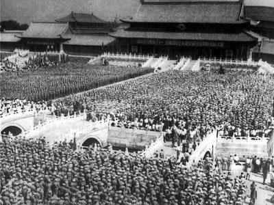 1950年8月1日上午,北京市区晴空万里,风和日丽,古老的故宫装饰一新,社会各界人士和解放军将士共4万余人在故宫太和门广场隆重集会,举行庆祝大会。主席台上方悬挂着巨大横幅,上写“北京各界庆祝‘八一’建军节,反对美国侵略台湾朝鲜示威大会”。人民解放军的军徽高高悬挂在两层琉璃瓦之间,熠熠生辉。新华社的报道说:“午门内外,招展着无数的红色的国旗、人民解放军军旗和许多朝鲜民主主义人民共和国的国旗。太和门正中高悬国旗,两侧悬挂着毛主席、朱总司令、斯大林大元帅和金日成将军的巨幅画像。主席台前高悬着八面大军旗。”