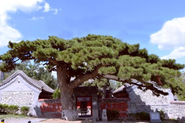 油松,一级古树,俗称迎客松,生长在海淀区凤凰岭自然风景区车耳营村关帝庙前,为辽代所植,至今已一千多年。它南侧的一个主枝向大道上长长地伸延,好像在迎接过往的来客,故名“迎客松”。