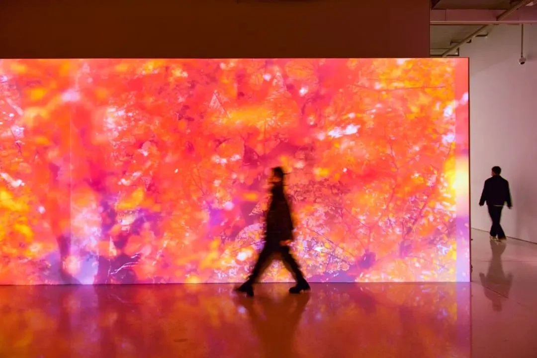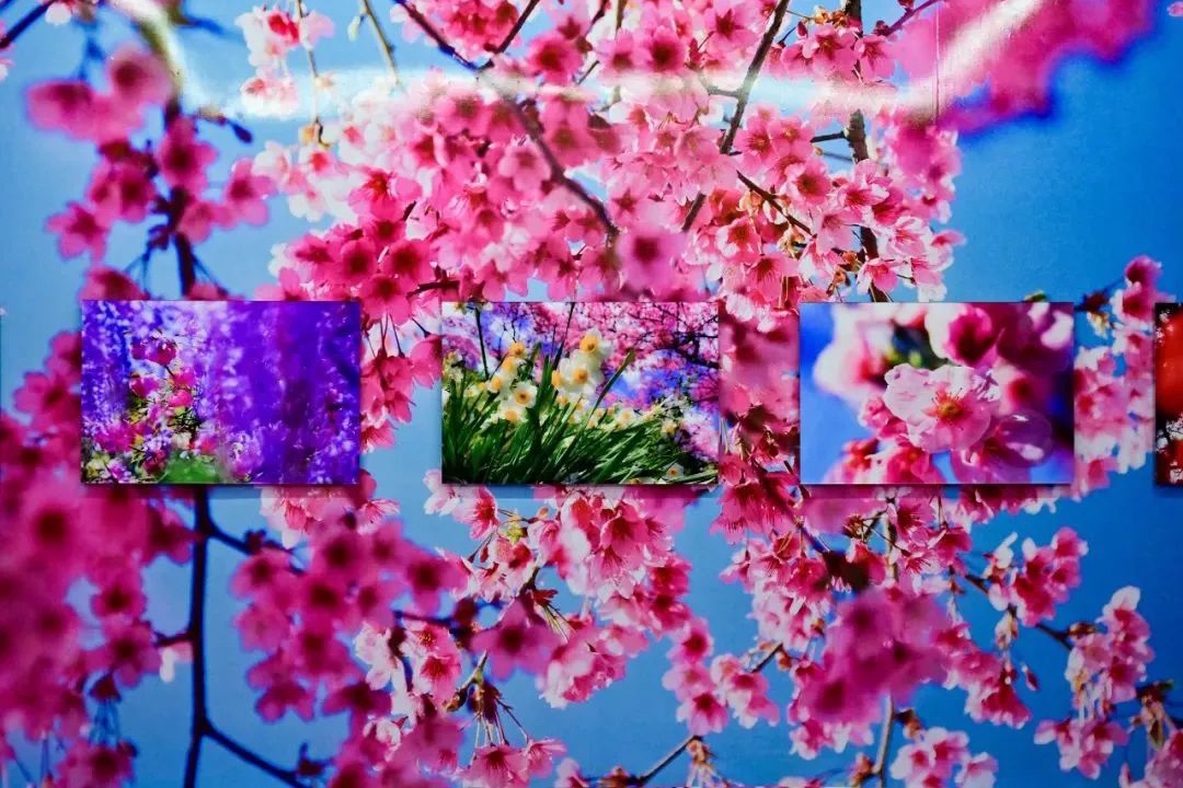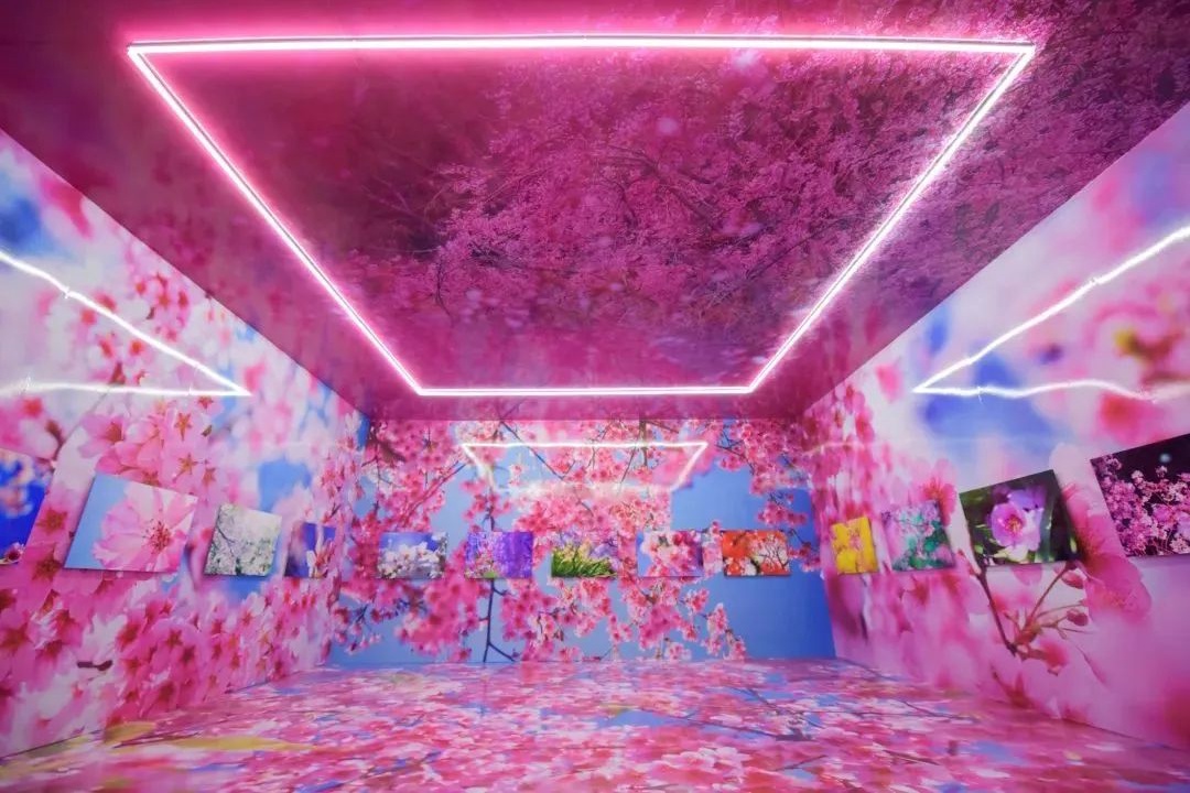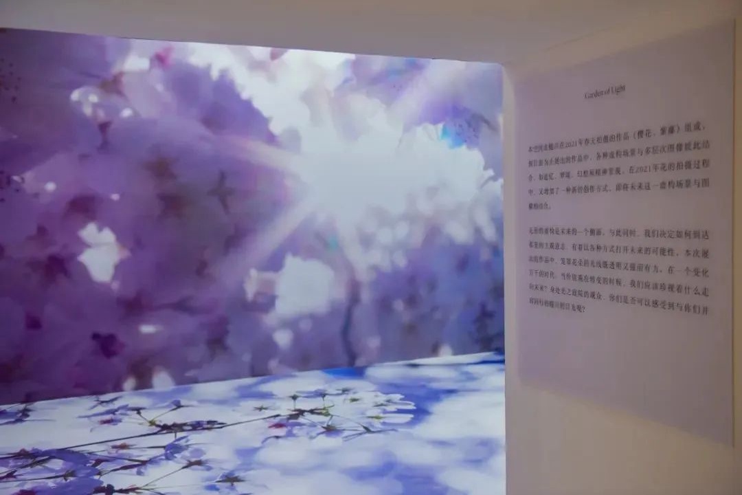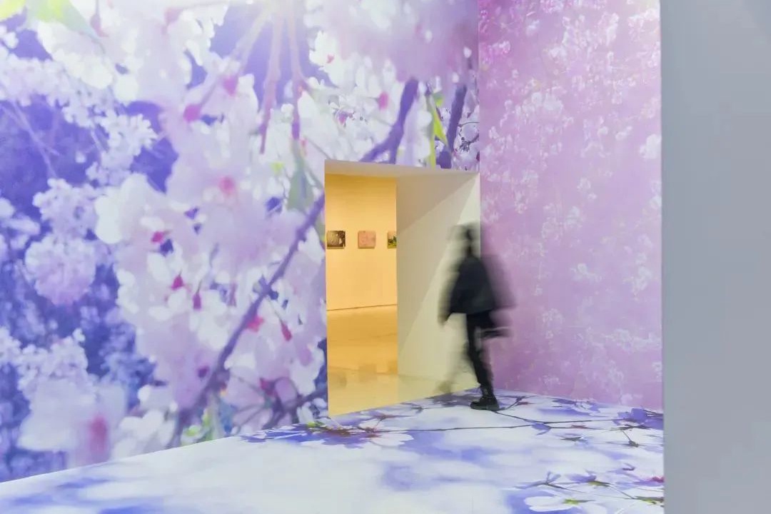 光斑与花交织的作品,像天国的光芒一样照亮了整个空间,这个空间由蜷川实花在2021年春天拍摄的樱花和紫藤照片组成,展示了未来的形象,象征着以各种方式打开的可能性。
