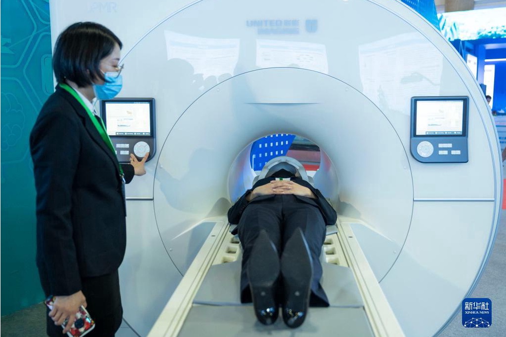 10月21日,在北京展览馆举行的国家“十三五”科技创新成就展上,工作人员展示上海联影一体化全身正电子发射/磁共振成像系统。新华社记者才扬摄