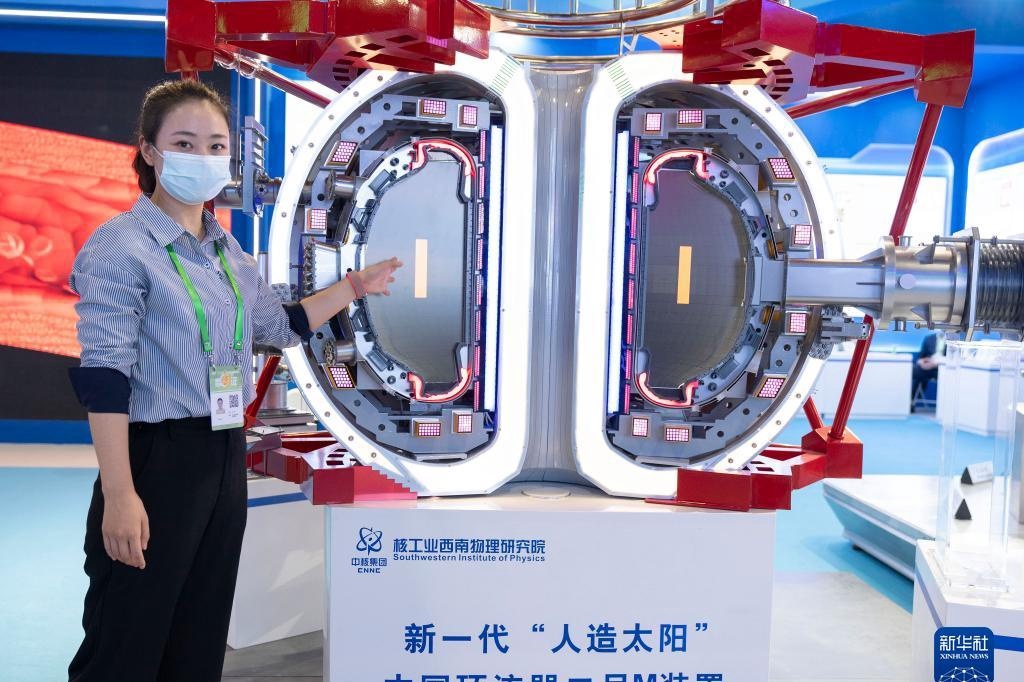 10月21日,在北京展览馆举行的国家“十三五”科技创新成就展上,工作人员介绍新一代“人造太阳”中国环流器二号M装置。新华社记者才扬摄