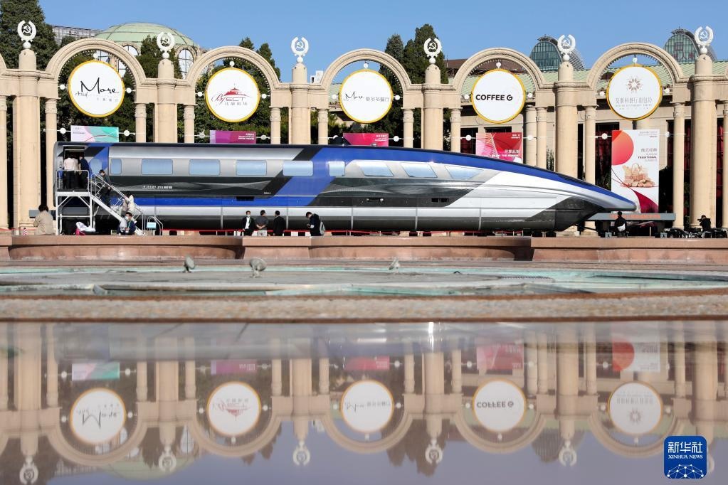 10月21日,观众在北京展览馆参观国家“十三五”科技创新成就展展出的时速600公里的高速磁浮列车。新华社记者金立旺摄