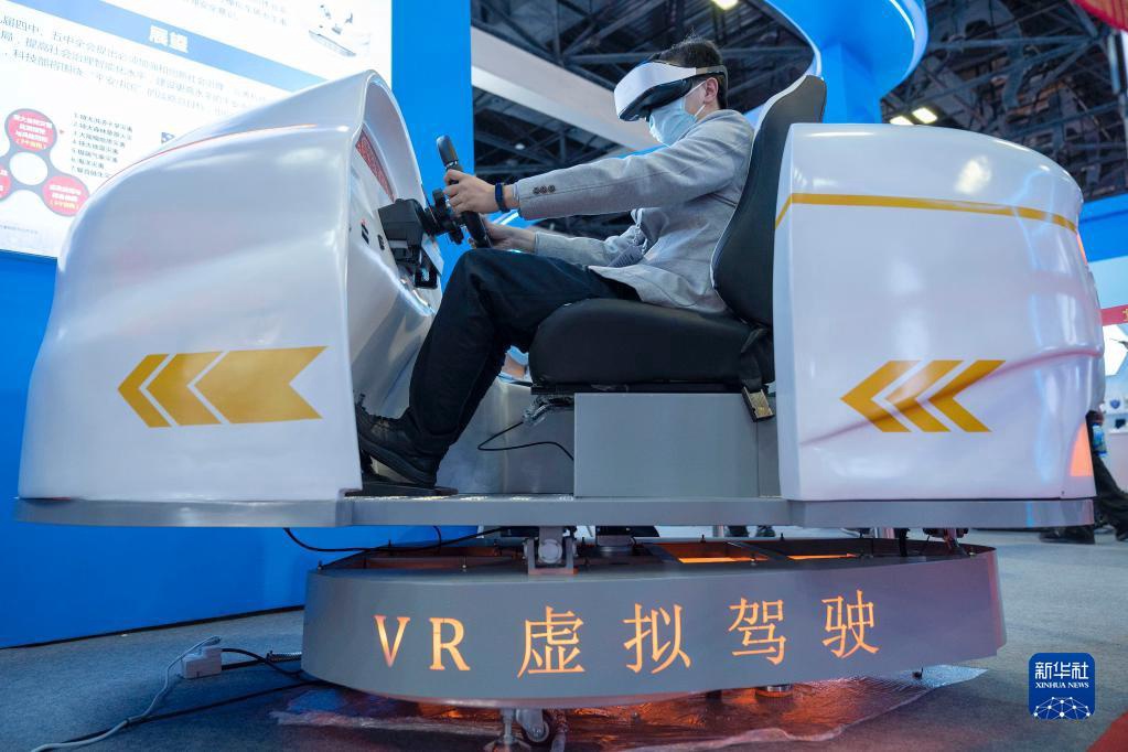 10月21日,在北京展览馆举行的国家“十三五”科技创新成就展上,一名观众体验VR虚拟驾驶。新华社记者才扬摄