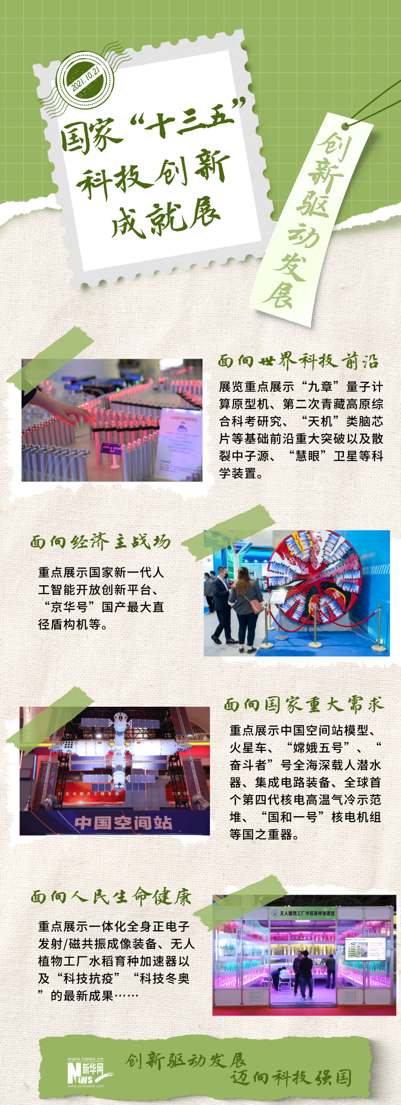 展览以“创新驱动发展迈向科技强国”为主题,以12个展区、1300多件实物、200多件模型、1740项展项等,在超过2万平方米的展区集中展示了“十三五”期间我国科技创新取得的重大进展和突出成就。
