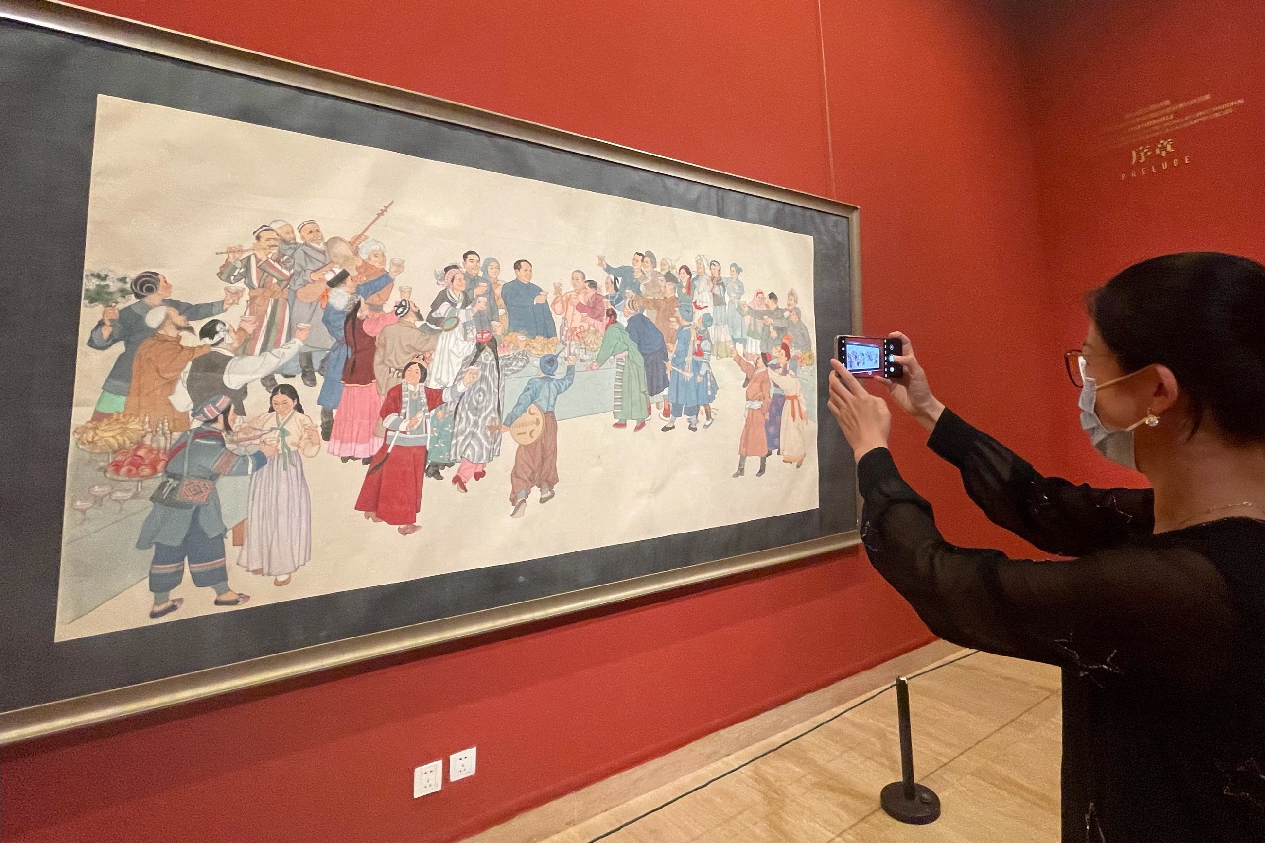 同时亮相圆厅的还有众多美术大师的经典作品。黄胄的国画《赶集》描绘了新疆维吾尔族人民欢乐的生活场景,董希文的油画《千年土地翻了身》体现了西藏百万农奴翻身做主人的喜悦心情,靳尚谊的油画《塔吉克新娘》展现了中国普通女性对幸福生活的追求和憧憬……这些都是新中国美术史上人物画的代表作。此外,刘开渠、吴为山的雕塑,吴作人、徐悲鸿、吴冠中的画作,郭沫若、林散之、赵朴初的书法作品等也同时展出。