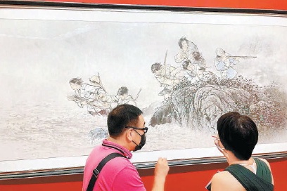 走进展厅,第一篇章“一掬丹心洒墨园”作为对王盛烈经典作品的回顾,重点展示了《八女投江》《海风》《耕者》《家乡的孩子》等代表作,将观众的思绪带回到那一段段特殊的历史时期:1957年的《八女投江》,以史诗般的鸿篇巨制,将东北抗日联军中八位无畏牺牲的女英雄形象铭刻史册;1962年的《海风》,以浓郁的时代气息,记录下新时期人民战士的昂扬斗志;1959年的《军民修水库》,更让观众仿佛置身那激情燃烧的生产建设岁月。