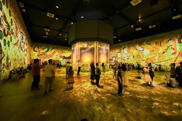 借200余幅常沙娜、鲍营等艺术家重绘的敦煌壁画作品,本次展览通过48台高清投影打造的数字光影效果,带领观众在高12米、总面积超1500平方米的展示空间中沉浸式地“遇见”敦煌。