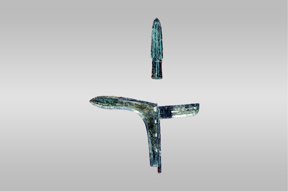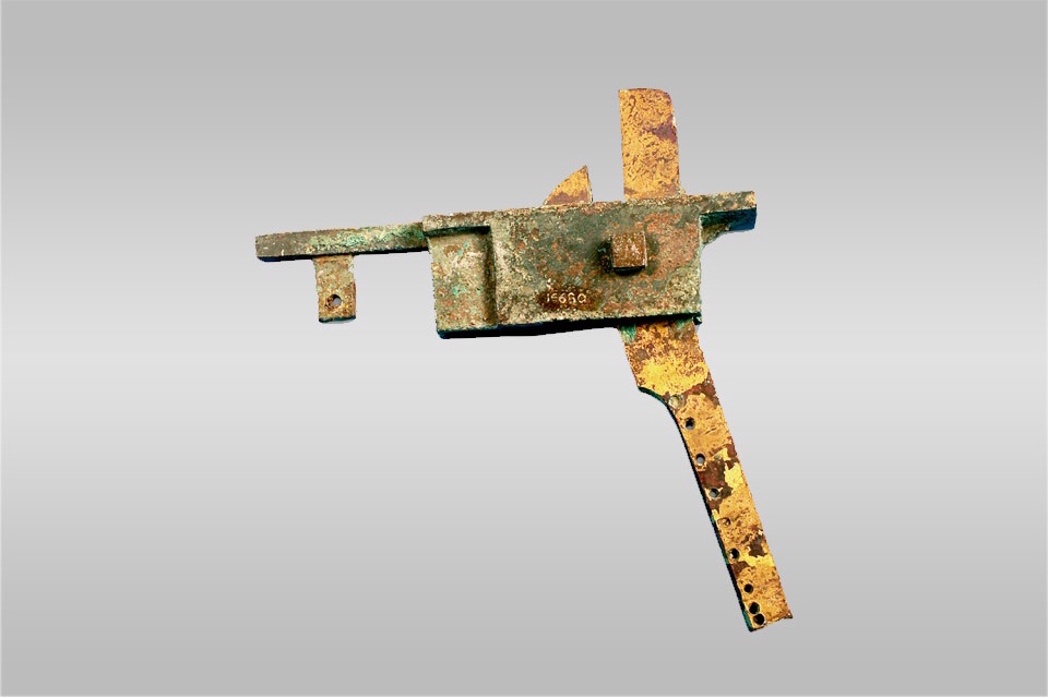 此弩机的望山部位鎏金。弩机鎏金为西汉贵族所用,非常少见。 山东省淄博市齐王墓随葬坑出土。