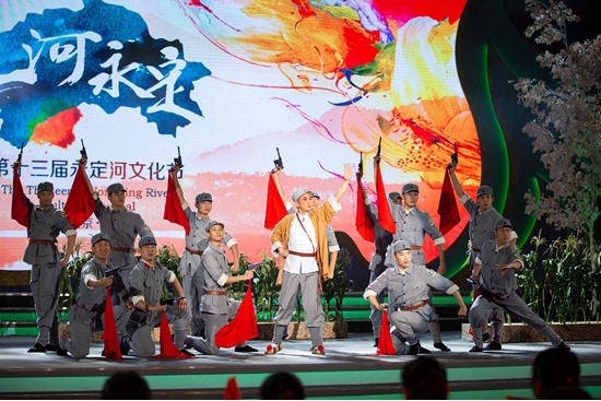 10月25日下午,第十三届永定河文化节开幕式——大型文艺史诗《一河永定》在门头沟永定河畔上演。开幕式通过开掘永定河历史文化的变迁,展现母亲河伴随共和国70年发展的成长历程,唤起民众强烈的爱国情感,展现出对家乡、对母亲河、对民族文化的家国情怀。整场演出共分为“红色的河”、“金色的河”、“绿色的河”三个篇章。