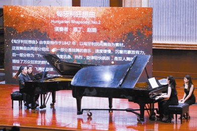 钢琴演奏家原丁来自中央音乐学院,她的演奏细腻、音色变化丰富,极富想象力和感染力。昨天的音乐会上,她与自己的两名学生赵璐、李胤萱以双钢琴联奏的形式,先后演绎了莫扎特的《小广板与快板》、勃拉姆斯的《海顿主题伴奏曲》、李斯特的《匈牙利狂想曲》等音乐作品。原丁与学生们配合默契,技巧娴熟,精彩的双钢琴演奏更显气势,将作品的整体结构和音乐内涵展现得更为丰富和宽阔,获得现场观众的热烈掌声。