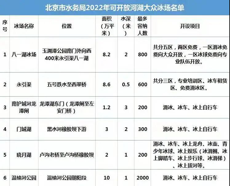 据北京市水务局,预计1月上旬,本市将根据天气和冰冻情况,陆续开放八一湖、永引渠西四环段、南护龙潭段、门城湖、晓月湖、温榆河公园等6处33万平方米河湖大众冰场,供市民参与体验冰上运动。