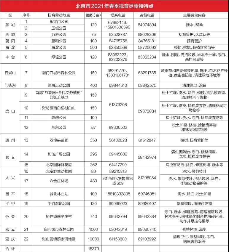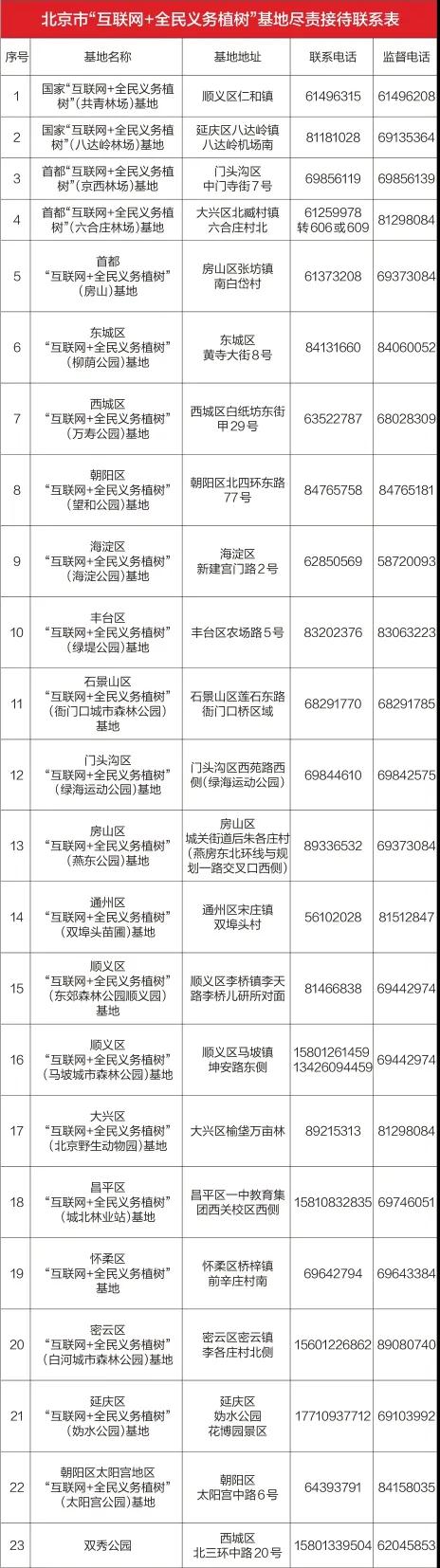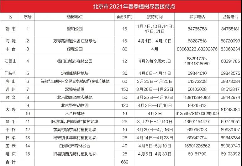 为更好地为首都市民履行植树义务提供服务,全市设立春季植树尽责接待点15处,可供植树面积669亩;设立林木抚育活动接待点22处,可抚育面积15379亩。另外,23个“互联网+全民义务植树”基地将提供多种尽责形式的全年化接待服务。