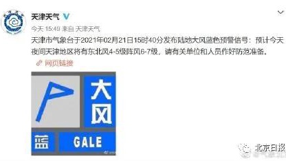 津冀发布大风、寒潮蓝警,21日下午津、冀地区先后发布了大风蓝色预警和寒潮蓝色预警。